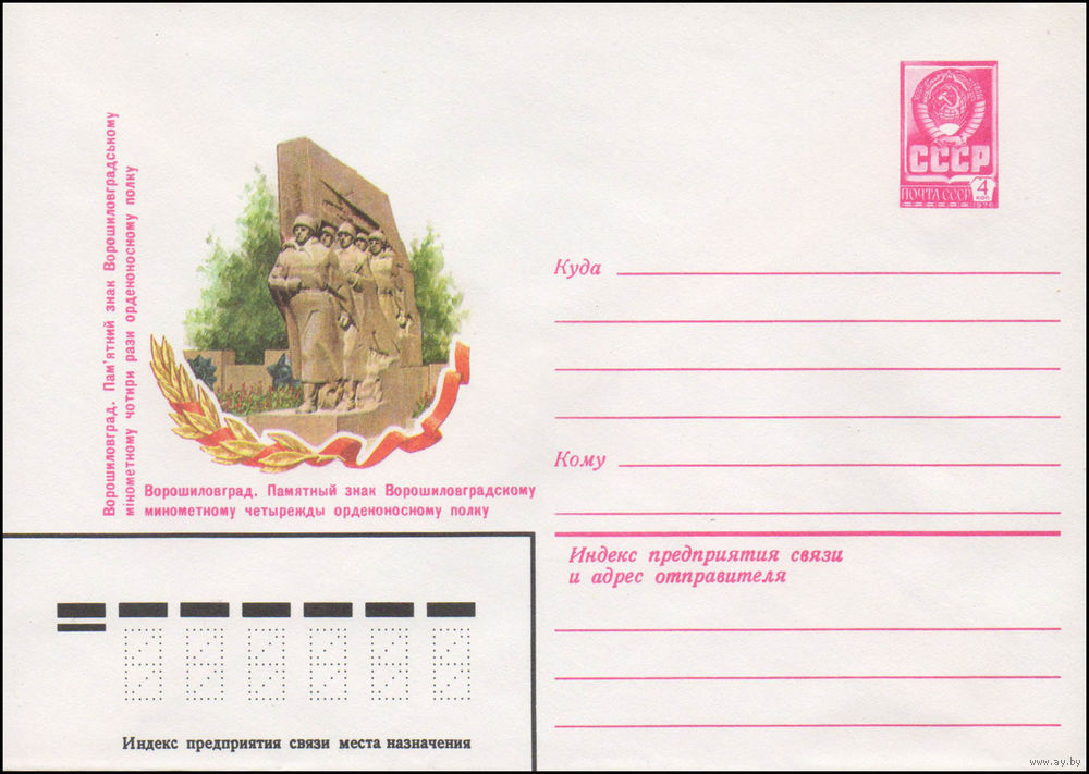 Художественный маркированный конверт СССР N 14563 (10.09.1980) Ворошиловград. Памятный знак Ворошиловградскому минометному четырежды орденоносному полку