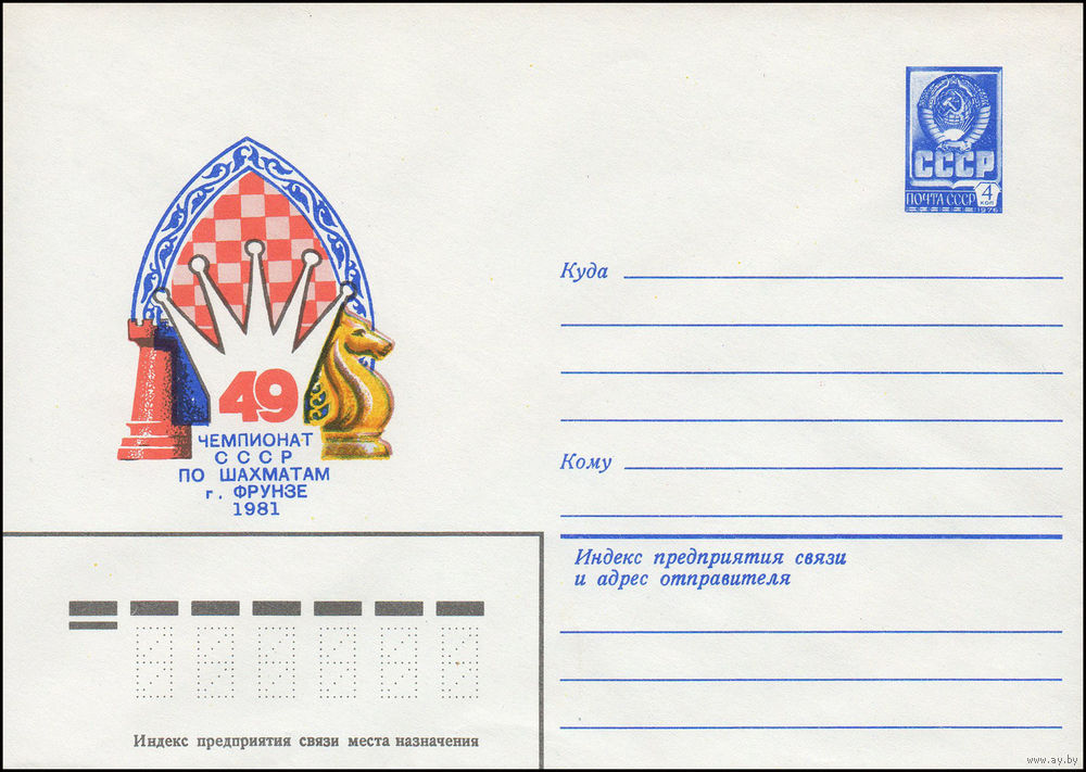 Художественный маркированный конверт СССР N 15183 (09.10.1981) Чемпионат СССР по шахматам г. Фрунзе 1981