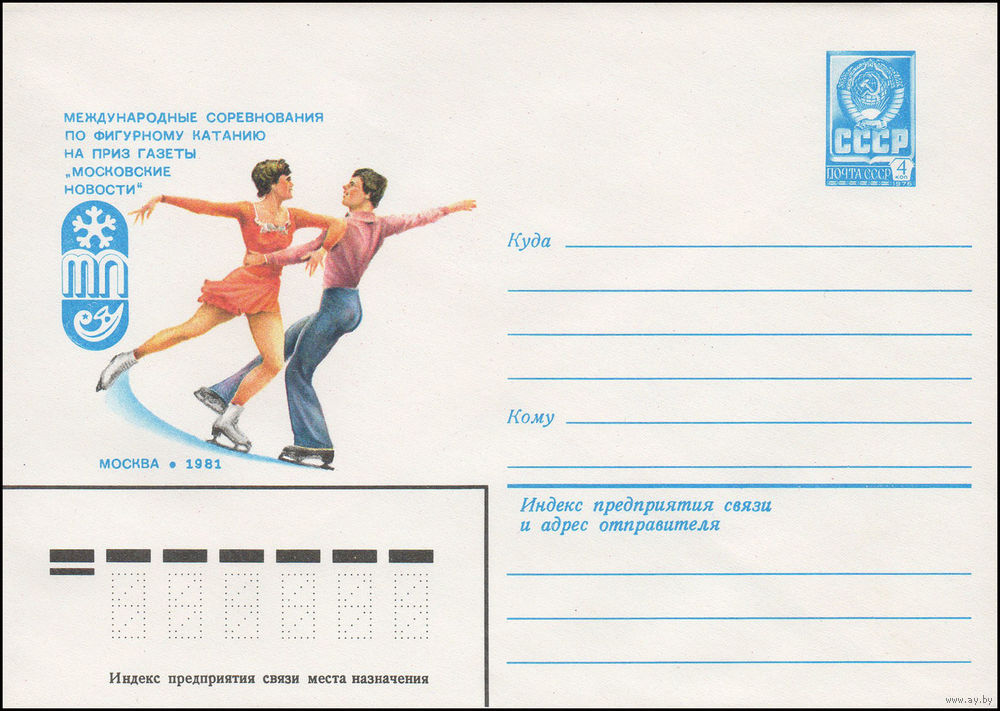 Художественный маркированный конверт СССР N 15246 (27.10.1981) Международные соревнования по фигурному катанию на приз газеты "Московские новости" Москва 1981