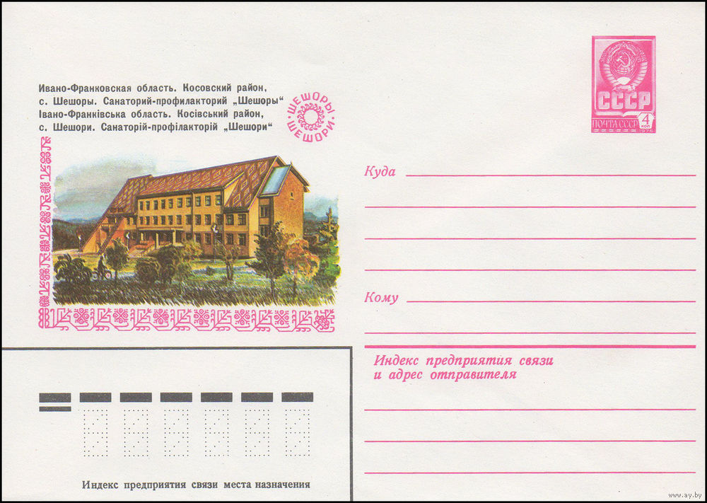 Художественный маркированный конверт СССР N 15402 (12.01.1982) Ивано-Франковская область. Косовский район, с. Шешоры. Санаторий-профилакторий "Шешоры"
