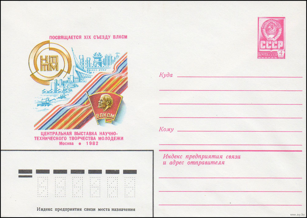 Художественный маркированный конверт СССР N 15465 (17.02.1982) Посвящается XIX съезду ВЛКСМ Центральная выставка научно-технического творчества молодежи Москва 1982