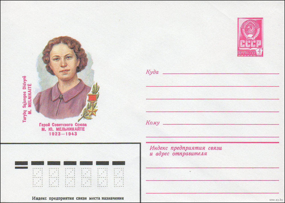 Художественный маркированный конверт СССР N 15919 (19.10.1982) Герой Советского Союза М.Ю.Мельникайте 1923-1943