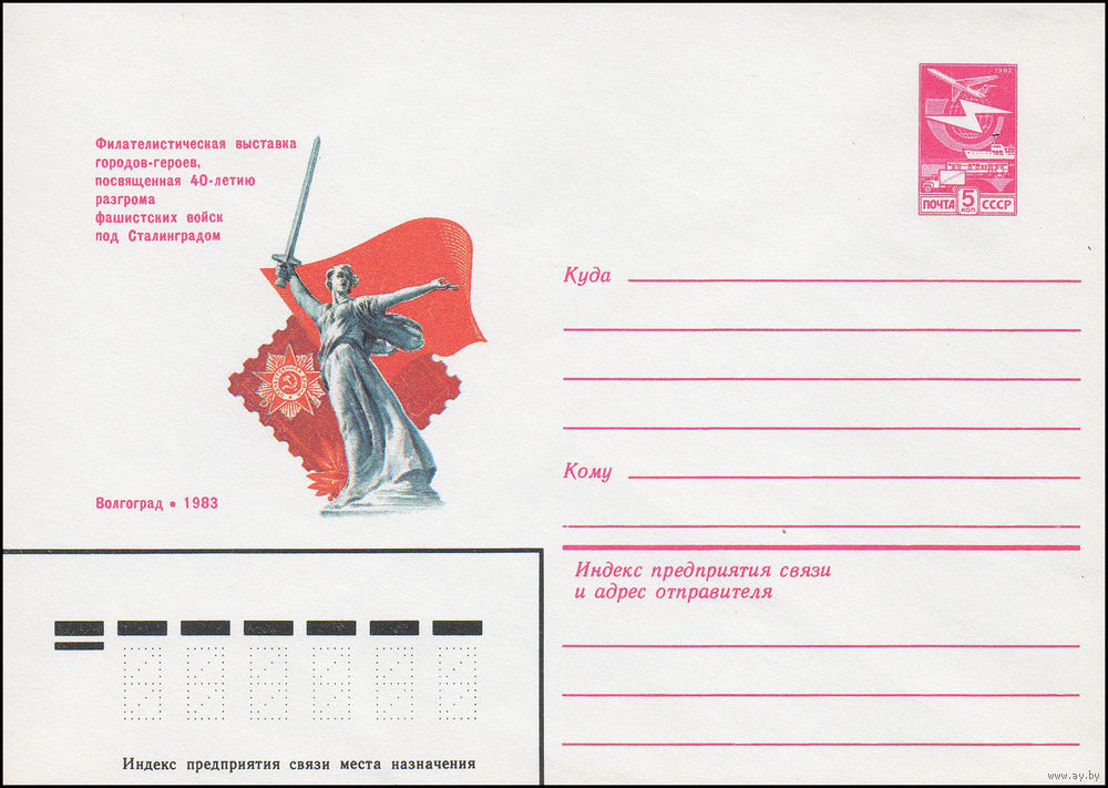 Художественный маркированный конверт СССР N 15979 (06.12.1982) Филателистическая выставка городов-героев, посвященная 40-летию разгрома фашистских сил под Сталинградом Волгоград 1983