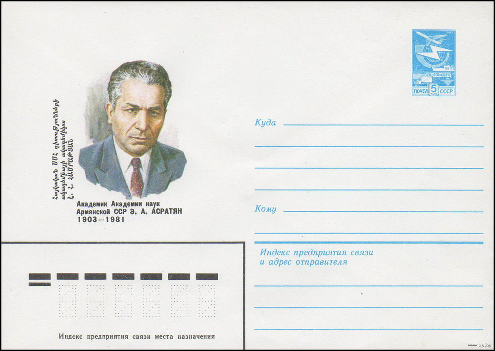 Художественный маркированный конверт СССР N 16005 (17.12.1982) Академик Академии наук Армянской ССР Э.А. Асратян 1903-1981
