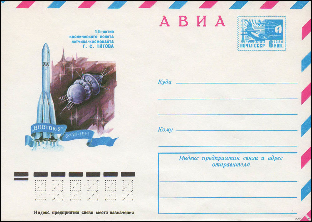 Художественный маркированный конверт СССР N 76-288 (11.05.1976) АВИА 15-летие космического полета летчика-космонавта Г.С. Титова "Восток-2" 6-7 VIII 1961