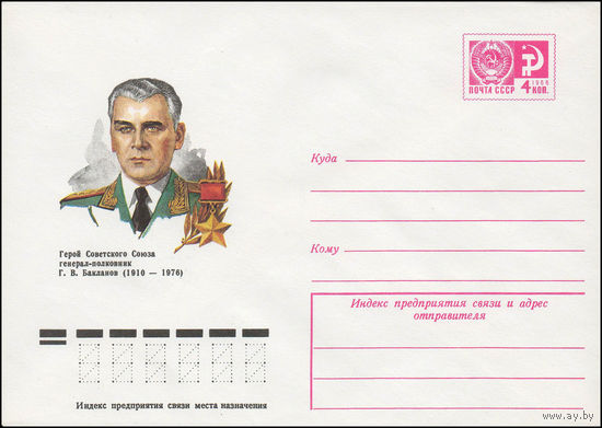 Художественный маркированный конверт СССР N 77-327 (14.06.1977) Герой Советского Союза генерал-полковник Г.В. Бакланов (1910-1976)