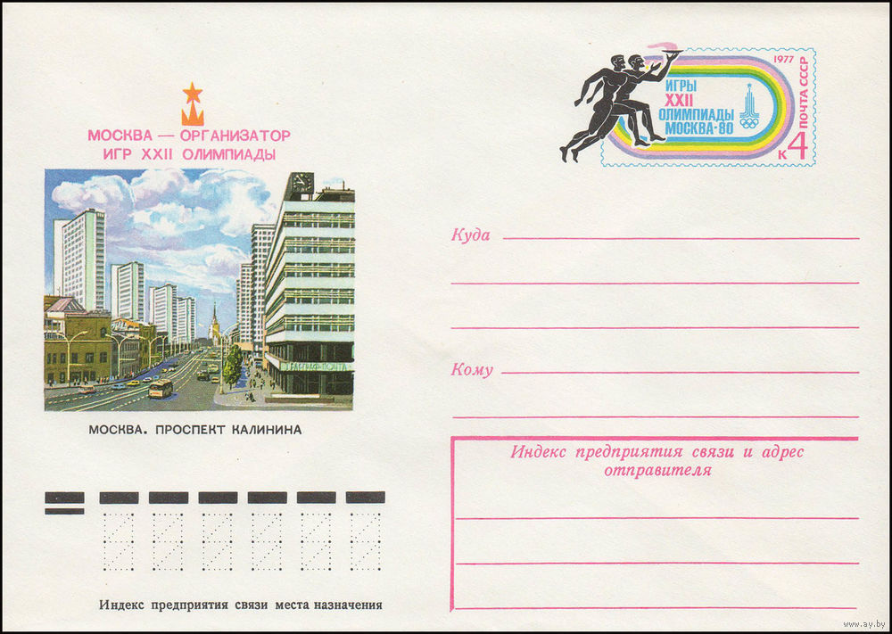 Художественный маркированный конверт СССР N 77-608 (10.10.1977) Москва - организатор игр XXII Олимпиады Москва. Проспект Калинина