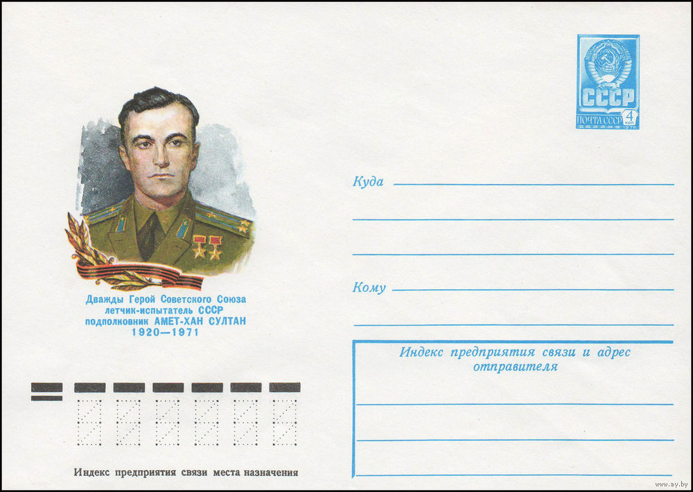 Художественный маркированный конверт СССР N 78-643 (06.12.1978) Дважды Герой Советского Союза летчик-испытатель СССР подполковник Ахмет-Хан Султан 1920-1971