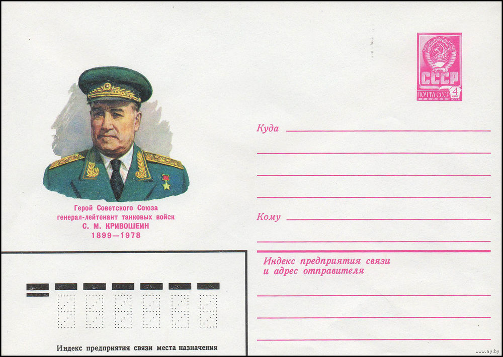 Художественный маркированный конверт СССР N 79-620 (24.10.1979) Герой Советского Союза генерал-лейтенант танковых войск С.М. Кривошеин 1899-1978