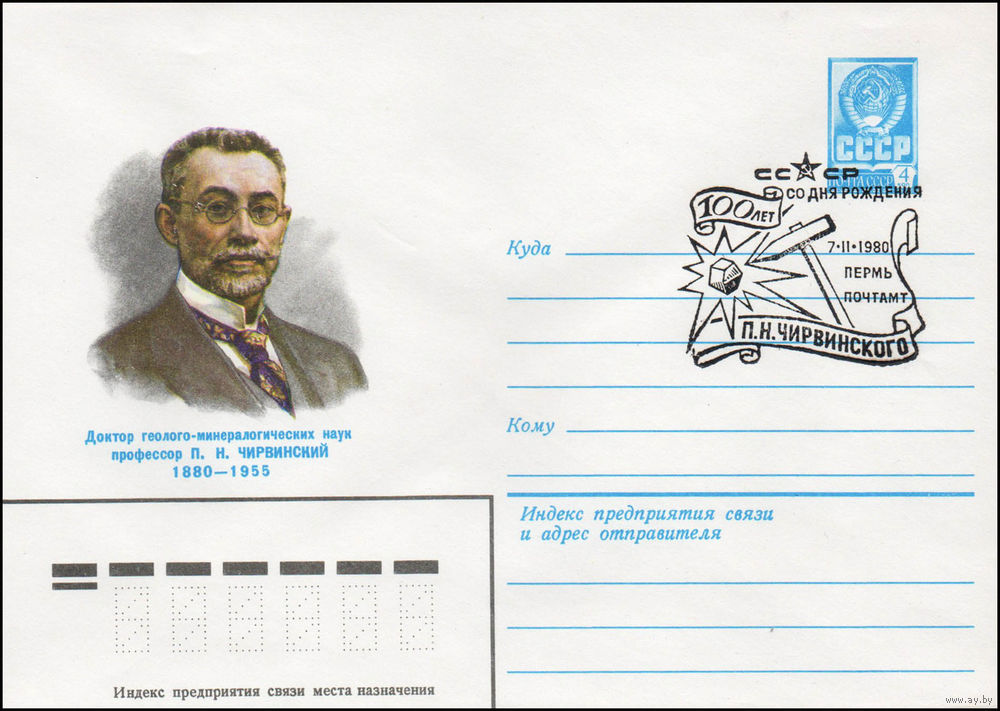 Художественный маркированный конверт СССР N 79-759(N) (28.12.1979) Доктор геолого-минералогических наук профессор П.Н. Чирвинский 1880-1955