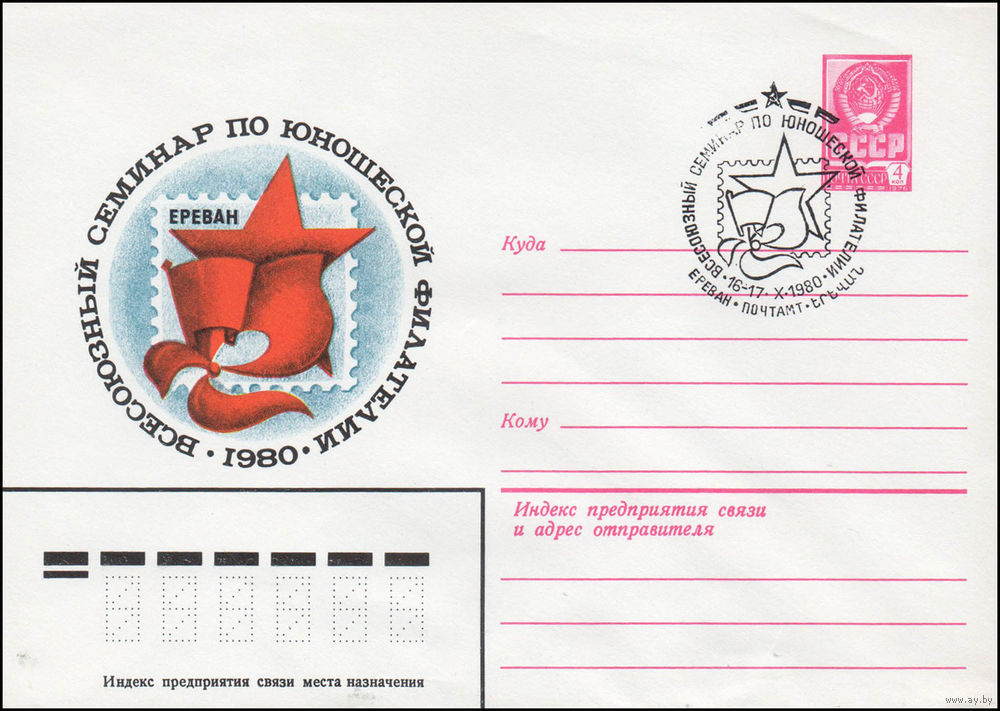 Художественный маркированный конверт СССР N 80-432(N) (09.07.1980) Всесоюзный семинар по юношеской филателии 1980 Ереван