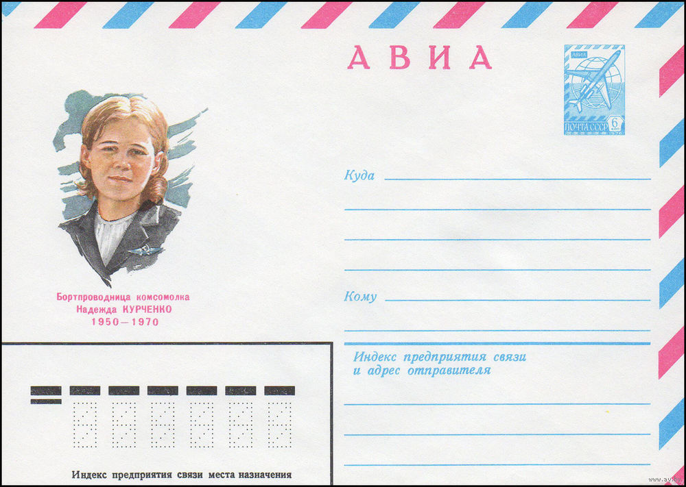 Художественный маркированный конверт СССР N 81-212 (29.04.1981) АВИА Бортпроводница комсомолка Надежда Курченко 1950-1970