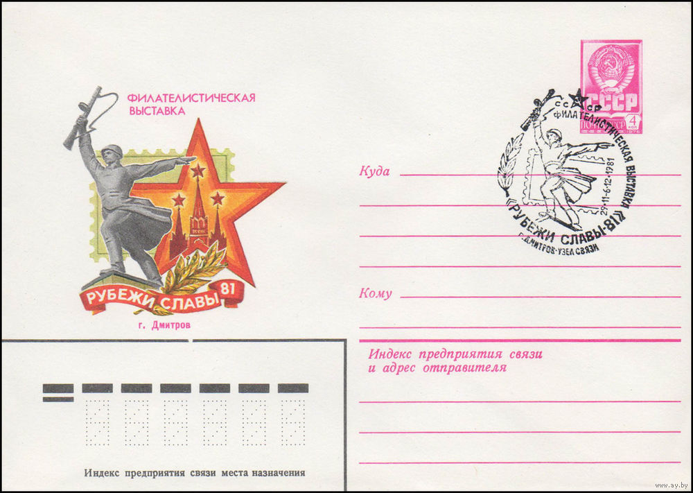 Художественный маркированный конверт СССР N 81-402(N) (15.09.1981) Филателистическая выставка Рубежи славы-81 г. Дмитров