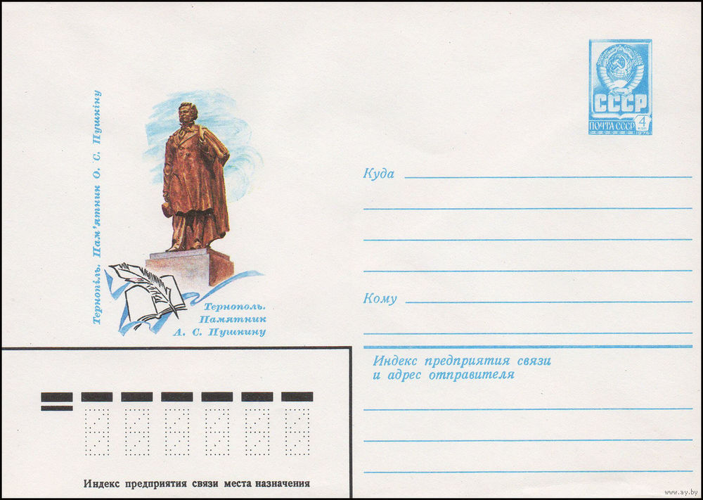 Художественный маркированный конверт СССР N 81-600 (22.12.1981) Тернополь. Памятник А.С. Пушкину