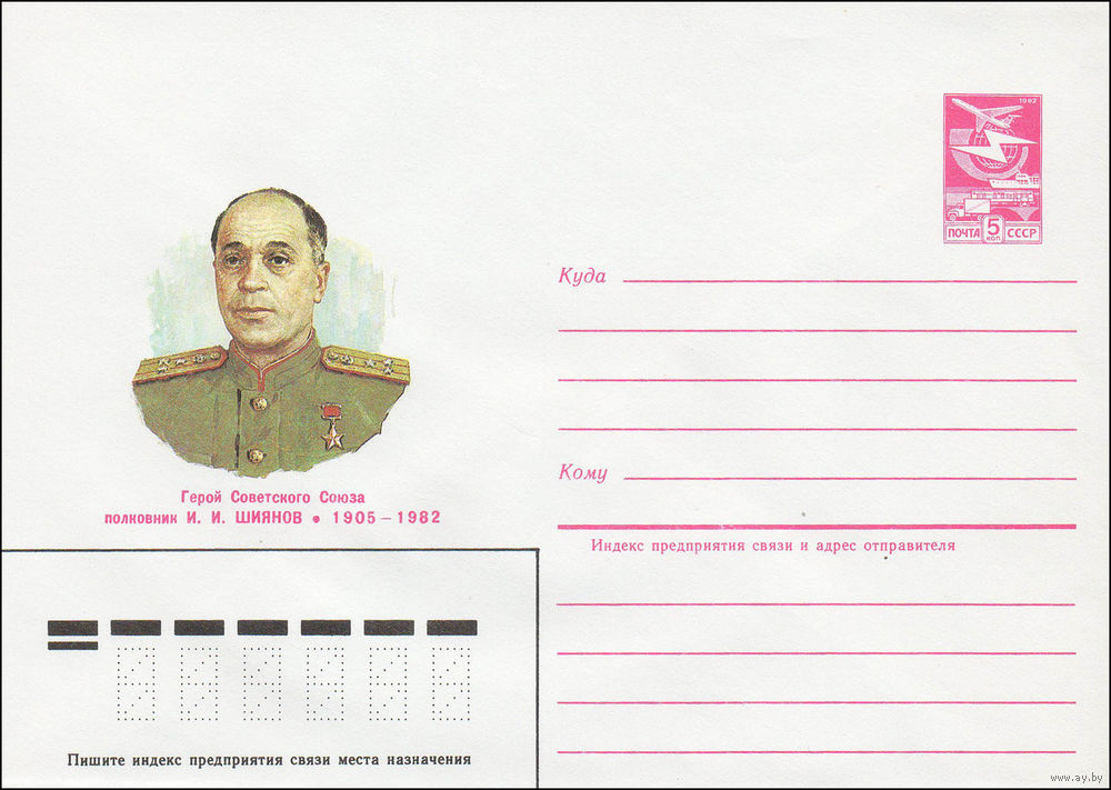 Художественный маркированный конверт СССР N 84-573 (24.12.1984) Герой Советского Союза полковник И.И. Шиянов 1905-1982