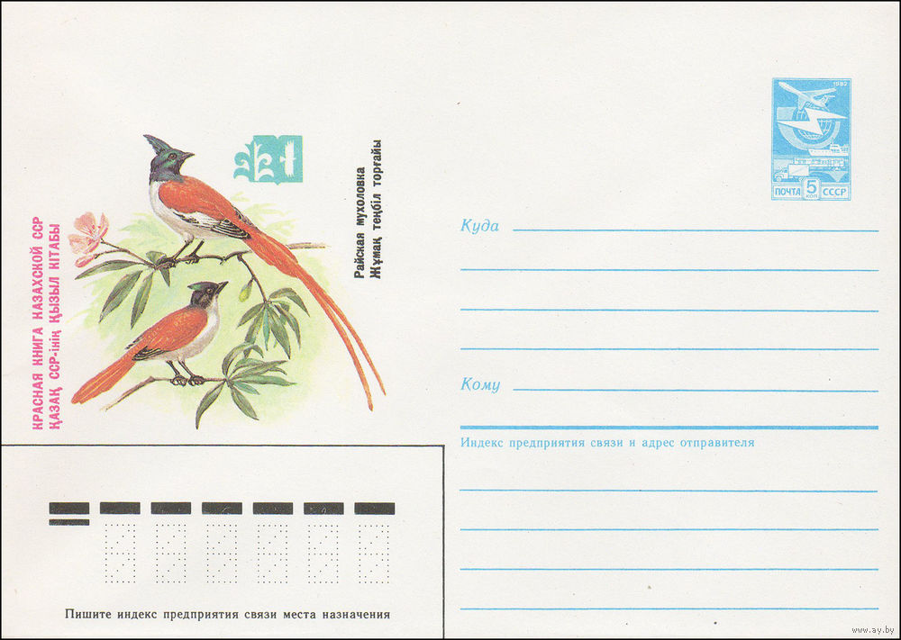 Художественный маркированный конверт СССР N 85-256 (13.05.1985) Красная книга Казахской ССР Райская Мухоловка