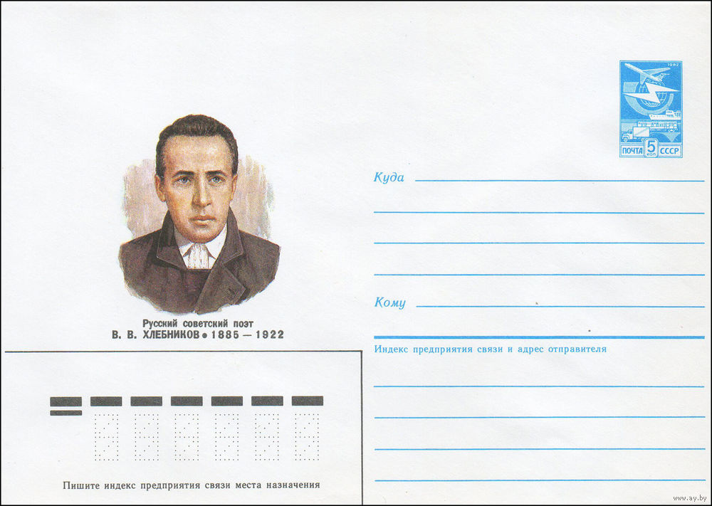 Художественный маркированный конверт СССР N 85-454 (18.09.1985) Русский советский поэт В. В. Хлебников 1885-1922