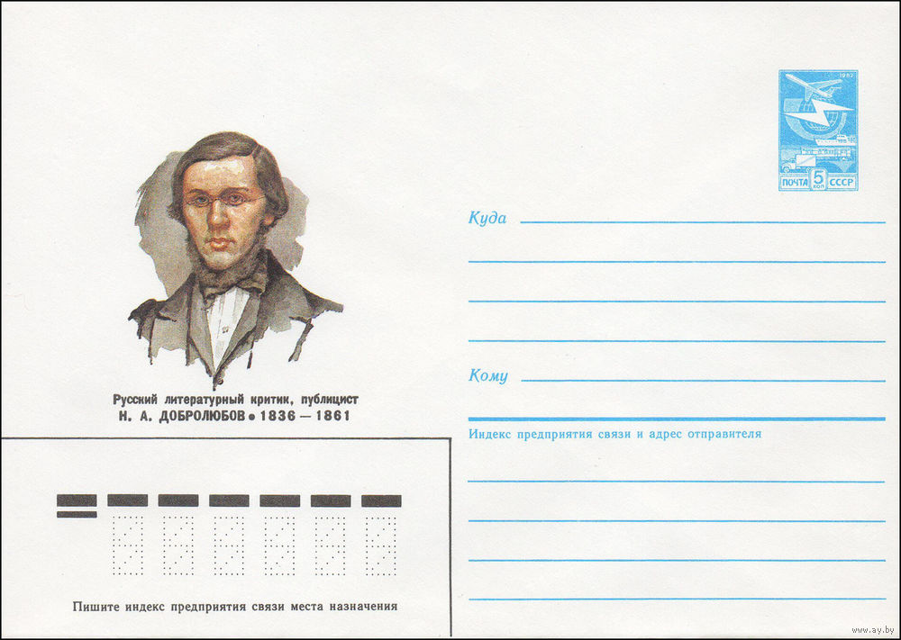 Художественный маркированный конверт СССР N 85-501 (23.10.1985) Русский литературный критик, публицист Н. А. Добролюбов 1836-1861