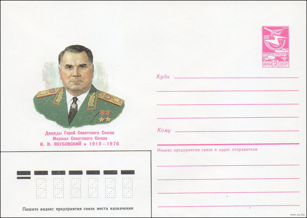 Художественный маркированный конверт СССР N 86-422 (29.08.1986) Дважды Герой Советского Союза Маршал Советского Союза И. И. Якубовский 1912-1976
