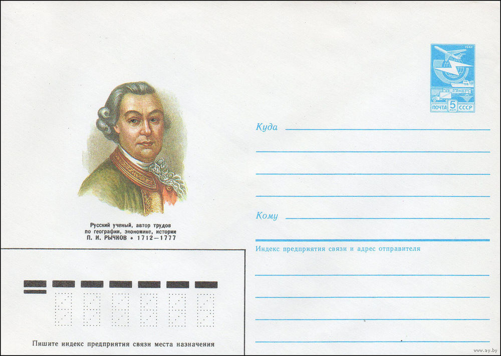 Художественный маркированный конверт СССР N 87-271 (22.05.1987) Русский ученый, автор трудов по географии, экономике, истории П. И. Рычков 1712-1777