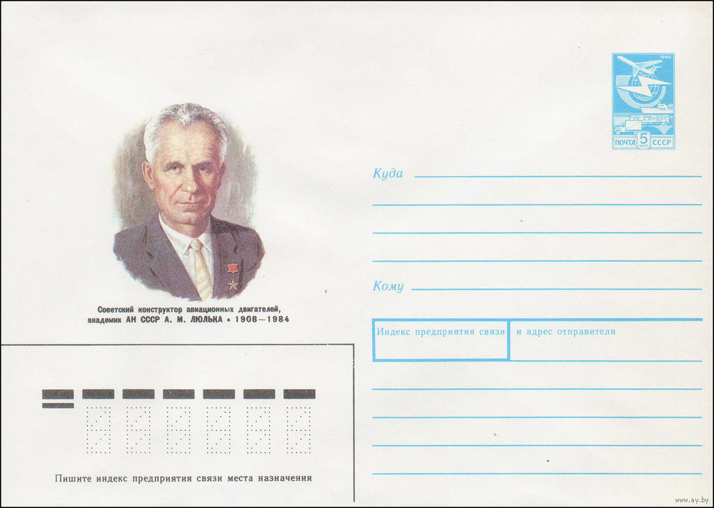 Художественный маркированный конверт СССР N 87-503 (27.11.1987) Советский конструктор авиационных двигателей, академик АН СССР А. М. Люлька 1908-1984