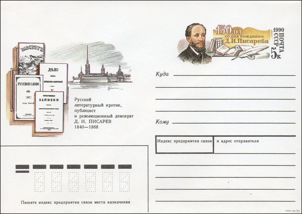 Художественный маркированный конверт СССР N 90-301 (26.06.1990) Русский литературный критик, публицист и революционный демократ Д. И. Писарев 1840-1868