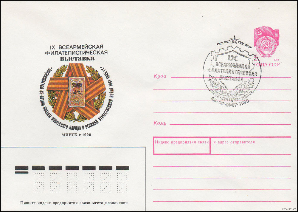 Художественный маркированный конверт СССР N 90-87(N) (26.02.1990) IX Всеармейская филателистическая выставка Минск 1990 Посвящается 45-летию победы советского народа в Великой Отечественной войне 19