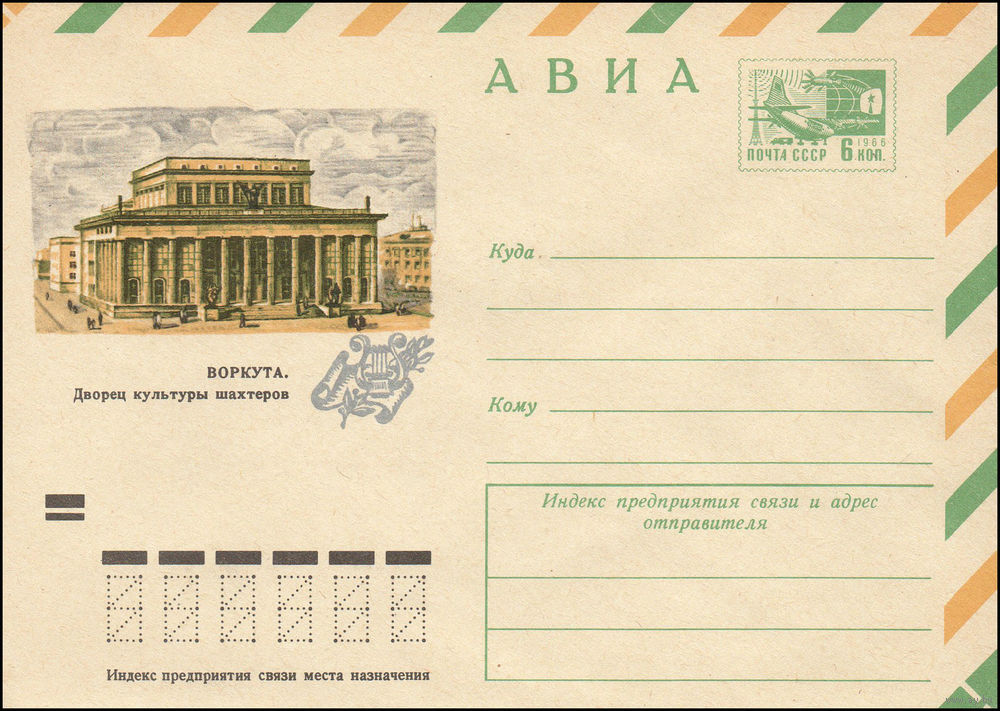 Художественный маркированный конверт СССР N 9088 (27.07.1973) АВИА Воркута. Дворец культуры шахтеров