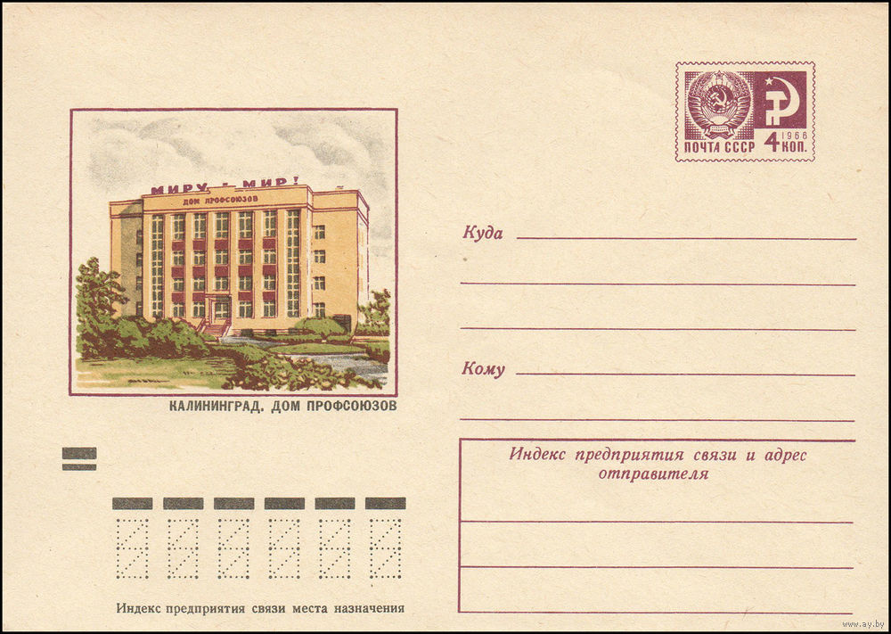 Художественный маркированный конверт СССР N 9093 (31.07.1973) Калининград. Дом профсоюзов