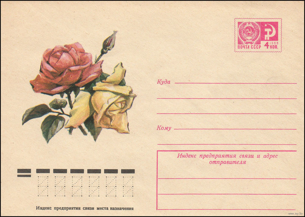 Художественный маркированный конверт СССР N 9460 (05.02.1974) Рисунок розовой и желтой роз