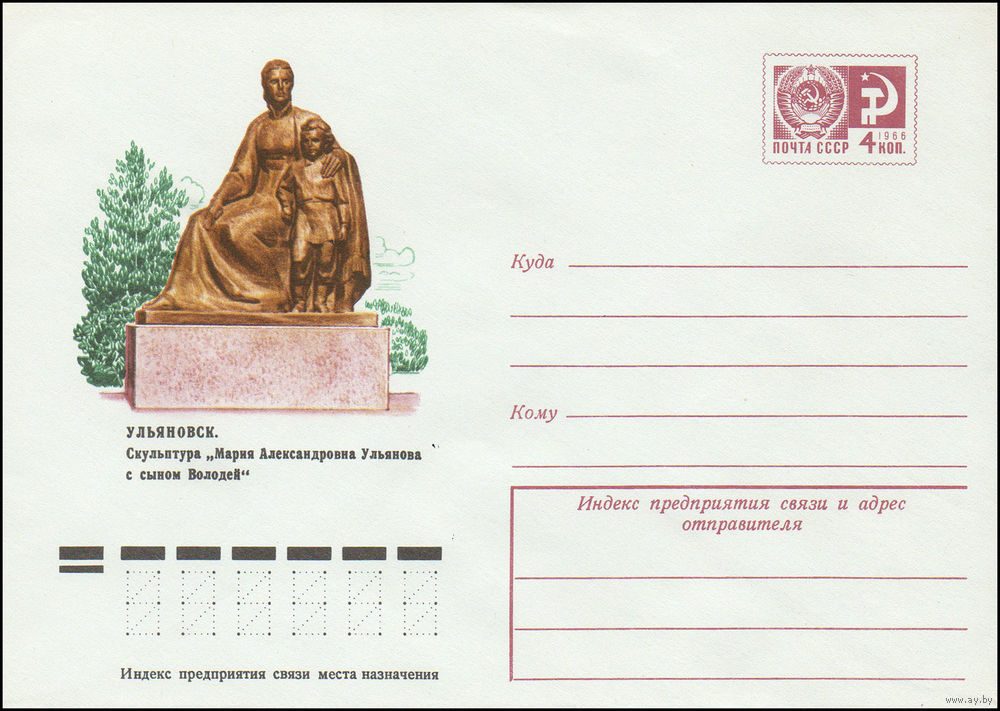 Художественный маркированный конверт СССР N 9740 (28.05.1974) Ульяновск. Скульптура "Мария Александровна Ульянова с сыном Володей"