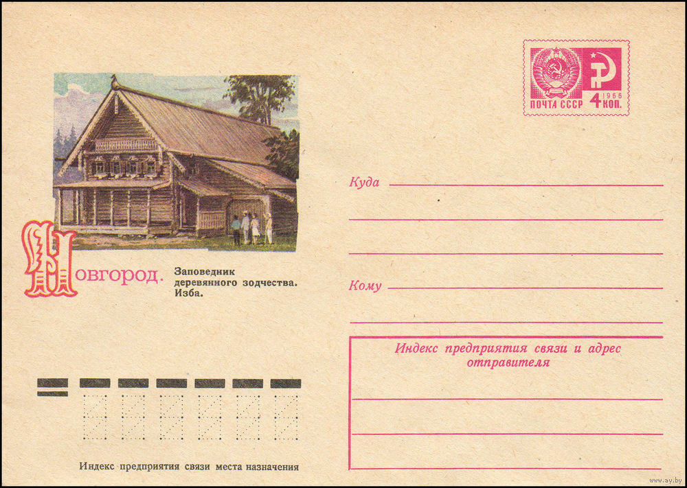 Художественный маркированный конверт СССР N 9767 (11.06.1974) Новгород. Заповедник деревянного зодчества. Изба.