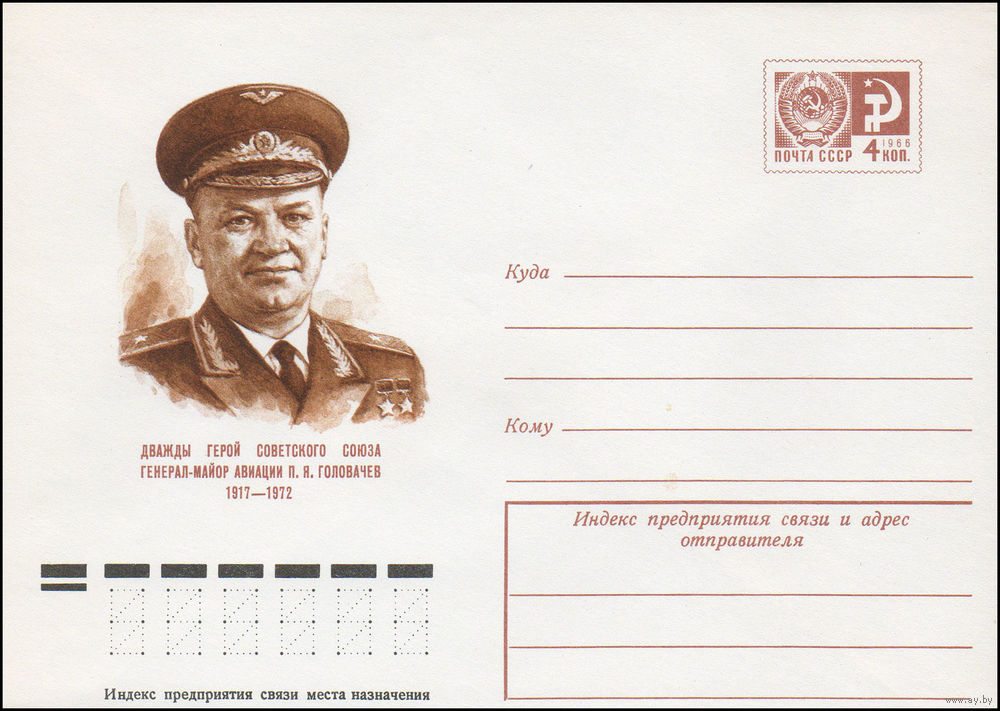Художественный маркированный конверт СССР N 9808 (25.06.1974) Дважды Герой Советского Союза генерал-майор авиации П.Я. Головачев 1917-1972