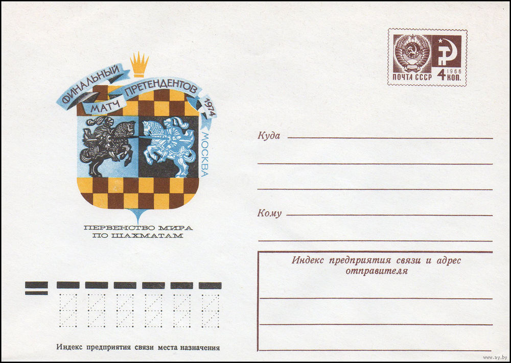 Художественный маркированный конверт СССР N 9865 (23.07.1974) Финальный матч претендентов 1974 Москва Первенство мира по шахматам
