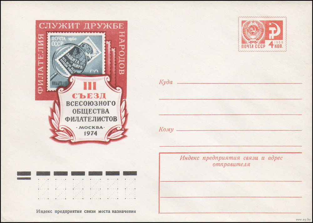 Художественный маркированный конверт СССР N 9879 (30.07.1974) Филателия служит дружбе народов III съезд Всесоюзного общества филателистов Москва 1974