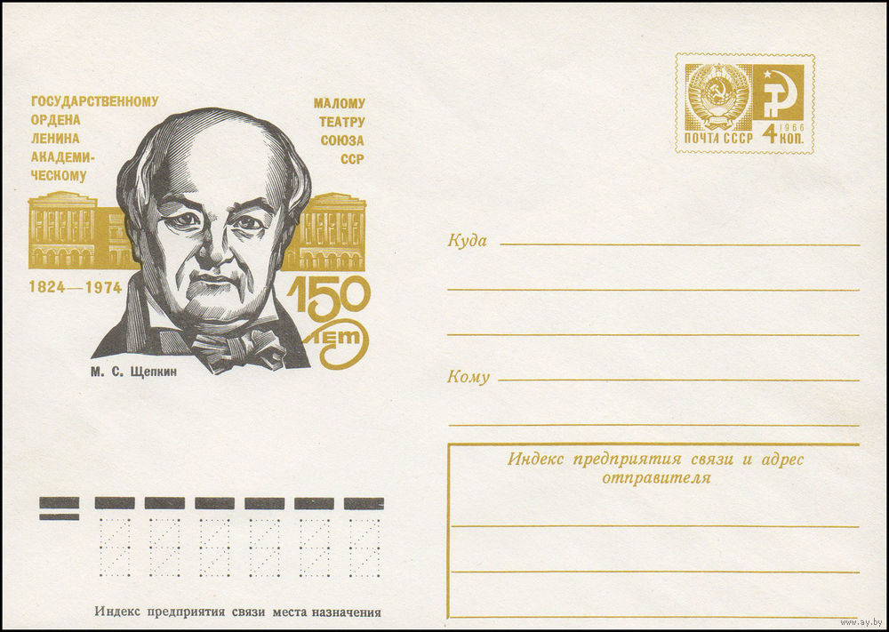 Художественный маркированный конверт СССР N 9895 (05.08.1974) 1824-1974 150 лет Государственному ордена Ленина академическому Малому театру Союза ССР М.С. Щепкин