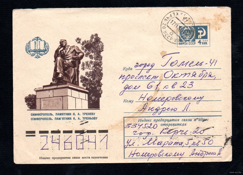 Художественный маркированный конверт СССР прошедший почту N 10012 (23.09.1974) Симферополь. Памятник К.А. Треневу