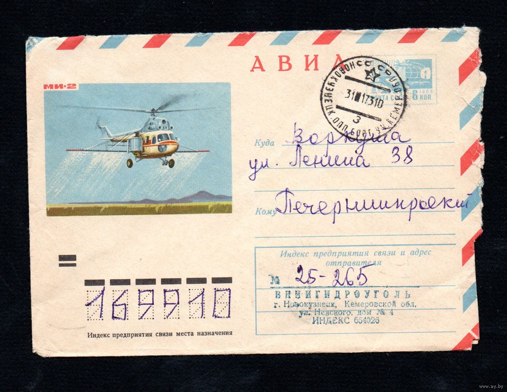 Художественный маркированный конверт СССР прошедший почту N 8470 (20.09.1972) АВИА МИ-2