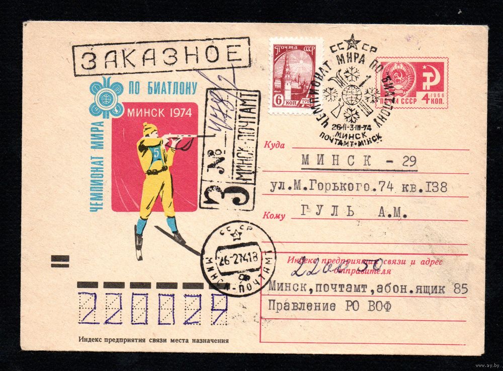 Художественный маркированный конверт СССР прошедший почту N 9306 (23.11.1973) Чемпионат мира по биатлону Минск 1974