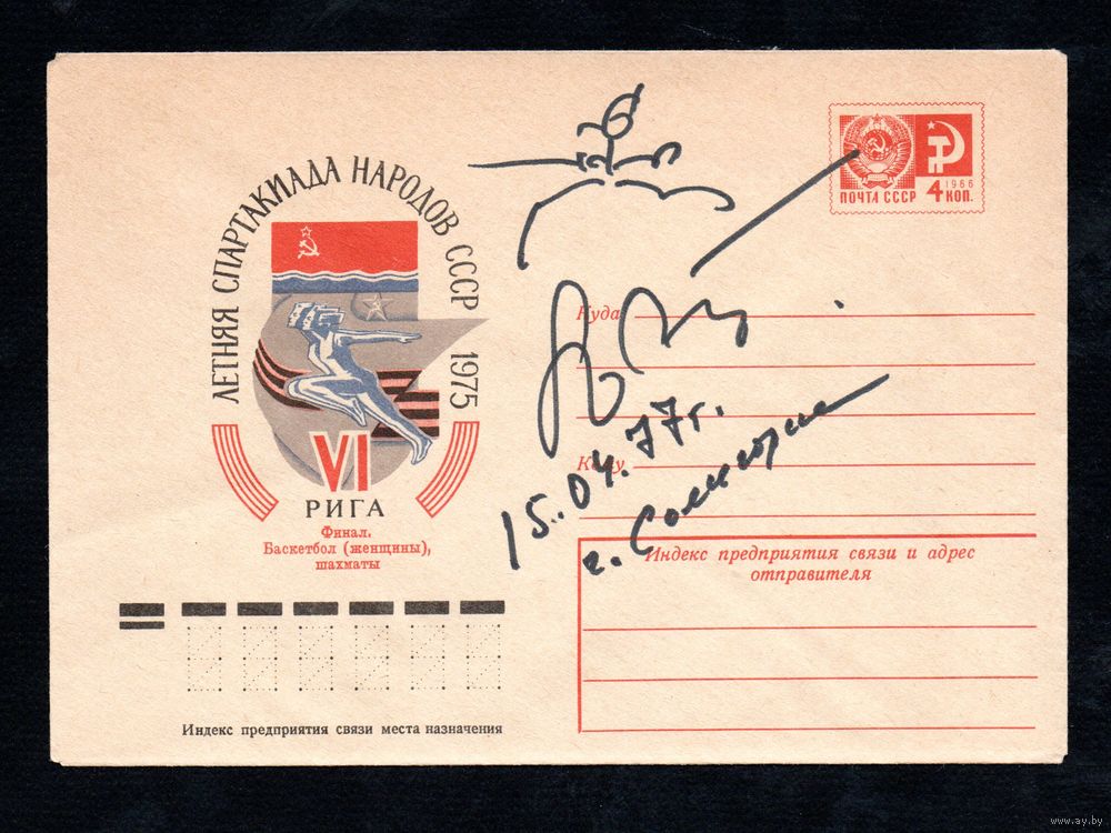 Художественный маркированный конверт СССР с автографом N 10301 (05.02.1975) VI летняя Спартакиада народов СССР 1975 Рига Финал. Баскетбол (женщины), шахматы