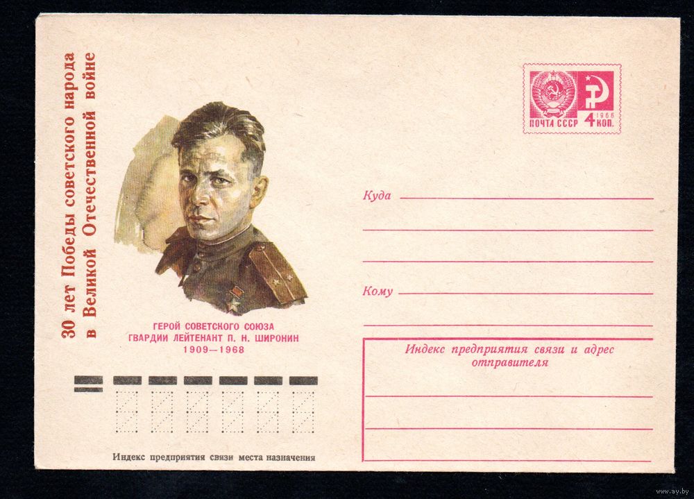 Художественный маркированный конверт СССР с надпечаткой N 10345 (26.02.1975) Герой Советского Союза гвардии лейтенант П.Н. Широнин 1909-1968
