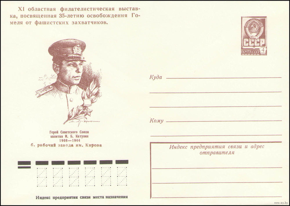 Художественный маркированный конверт СССР с надпечаткой N 13082 (25.09.1978) Герой Советского Союза капитан И.Б. Катунин 1908-1944