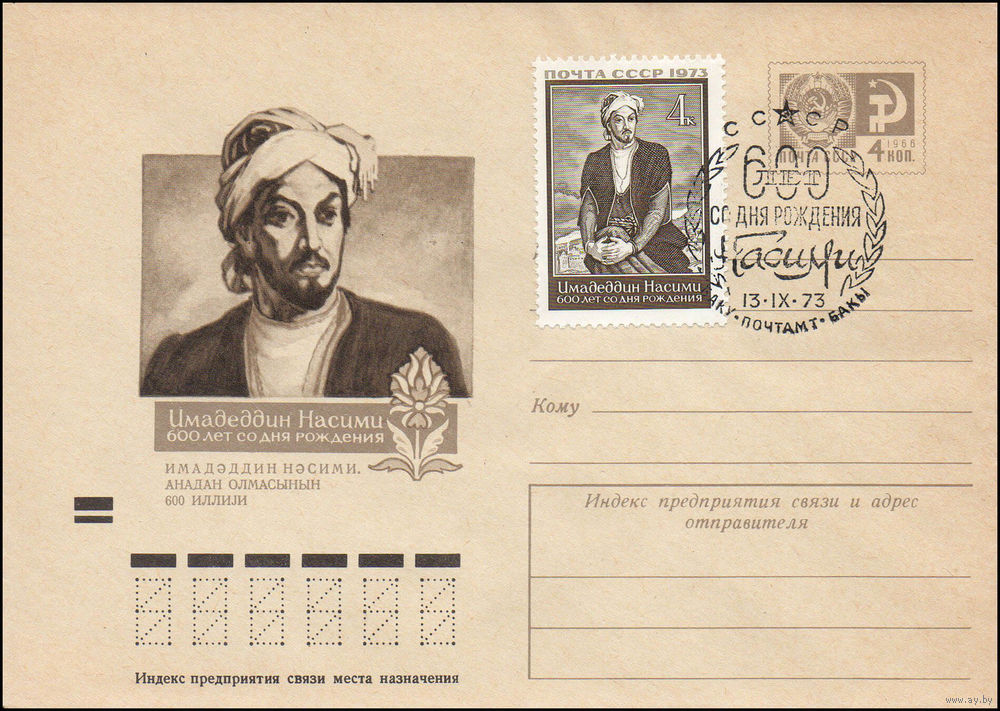 Художественный маркированный конверт СССР со СГ N 73-313(N) (07.06.1973) Имадеддин Насими 600 лет со дня рождения