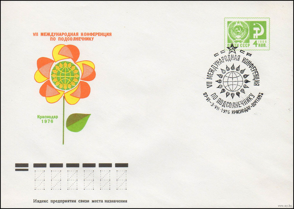 Художественный маркированный конверт СССР со СГ N 76-111(N) (20.02.1976) VII Международная конференция по подсолнечнику Краснодар 1976