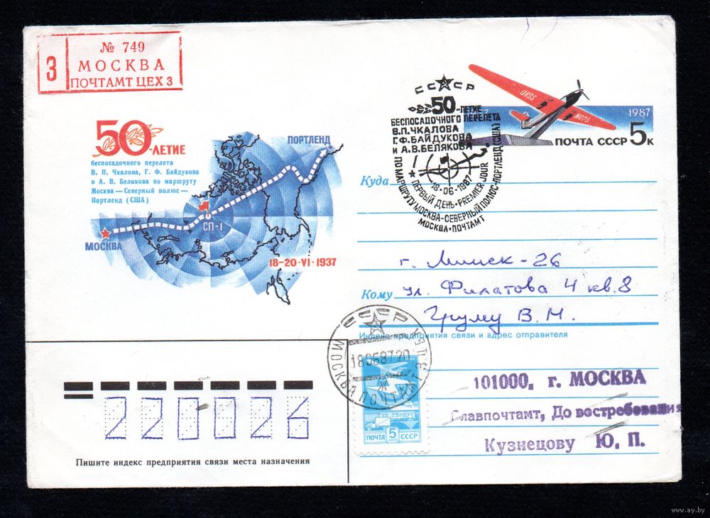 Художественный маркированный конверт СССР со СГ прошедший почту N 86-599 (19.12.1986) 50-летие беспосадочного перелета В.П. Чкалова, Г.Ф. Байдукова и А.В. Белякова