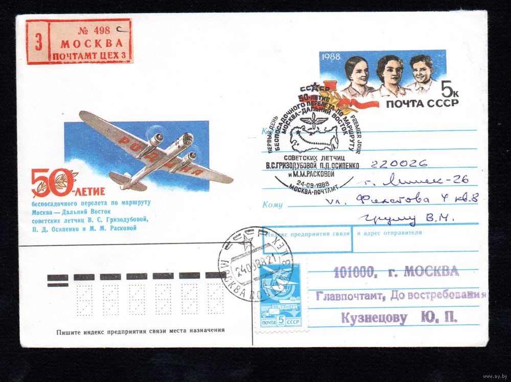 Художественный маркированный конверт СССР со СГ прошедший почту N 88-232 (20.04.1988) 50-летие беспосадочного перелета по маршруту Москва - Дальний Восток