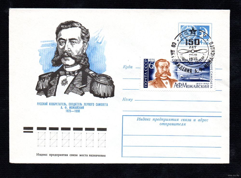 Художественный маркированный конверт СССР со спецгашением N 10051 (17.10.1974) Русский изобретатель, создатель первого самолета А.Ф. Можайский 1825-1890