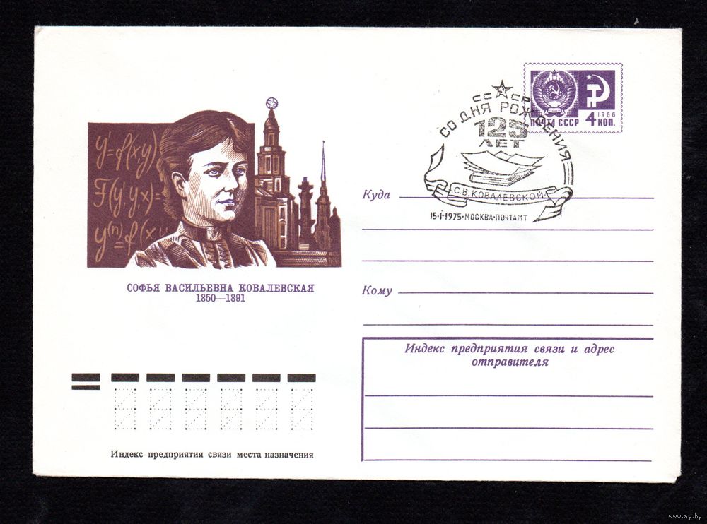 Художественный маркированный конверт СССР со спецгашением N 10151 (03.12.1974) Софья Васильевна Ковалевская 1850-1891