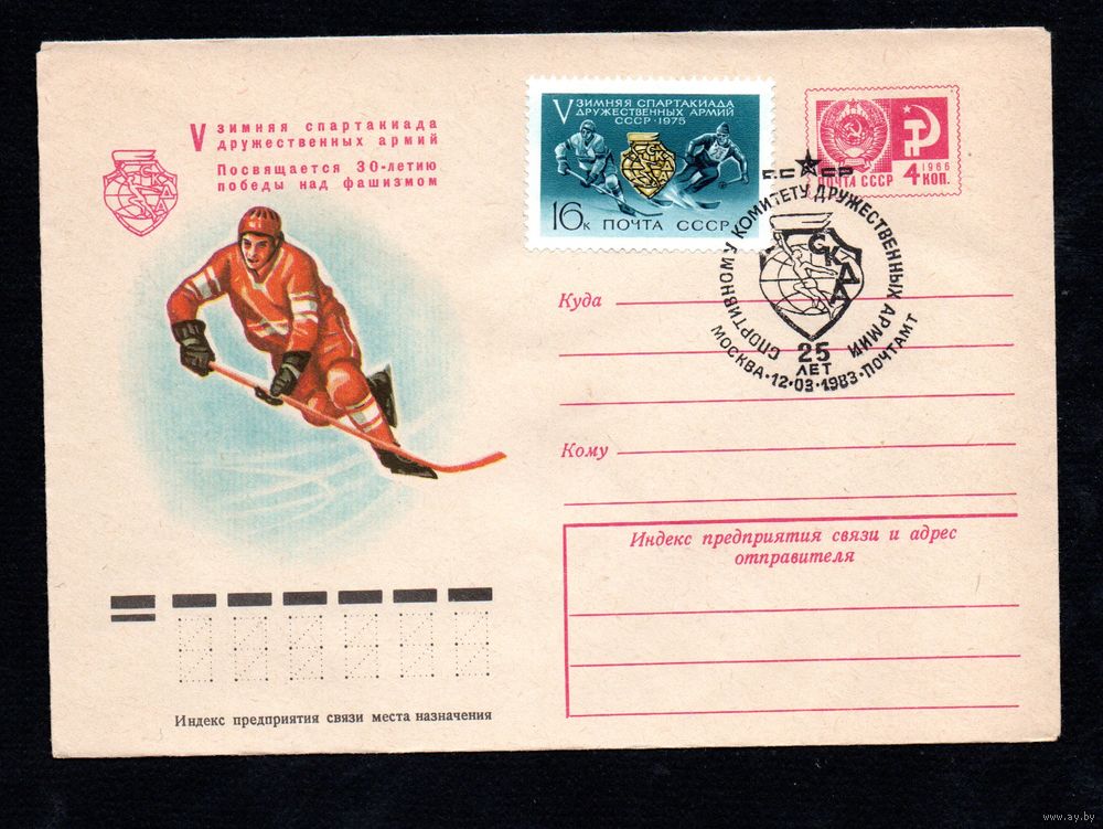 Художественный маркированный конверт СССР со спецгашением N 10230 (02.01.1975) V зимняя спартакиада дружественных армий Посвящается 30-летию победы над фашизмом [Хоккей]