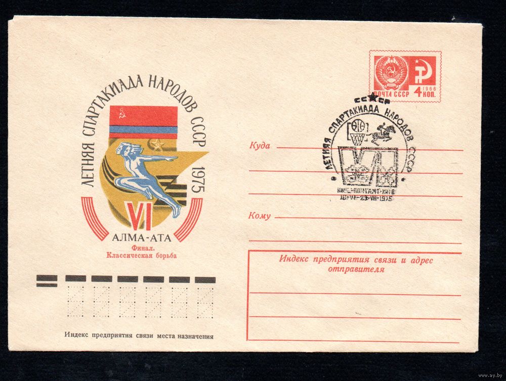 Художественный маркированный конверт СССР со спецгашением N 10274 (22.01.1975) VI летняя Спартакиада народов СССР 1975 Алма-Ата Финал. Классическая борьба